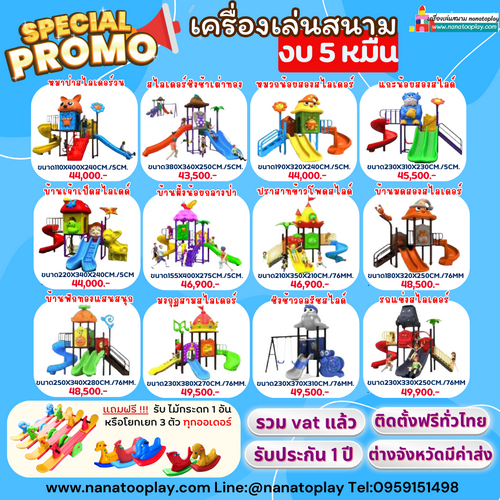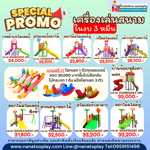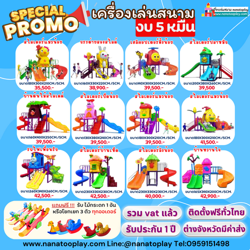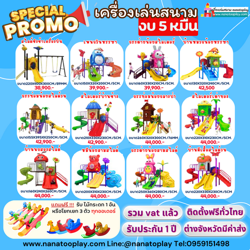 นานาทูคิดส์ Nana2kids ดำเนินกิจการร้านของเล่นเด็ก สินค้าเด็กมากว่า 10 ปี โดยจำหน่ายทั้งปลีกและส่ง ในส่วนของเครื่องเล่นสนามเป็นส่วนหนึ่งที่ขยายงานมาจากร้านของเล่นเด็ก โดยทางร้านมีโกดังสินค้าเตรียมพร้อมสำหรับลูกค้า พร้อมทั้งทีมงานตรวจเชคสินค้าก่อนจัดส่งดังนั้นทางร้านมั่นใจได้ว่าได้รับสินค้าที่มีคุณภาพแน่นอนค่ะ สอบถามรายละเอียดหรือต้องการใบเสนอราคา สามารถสอบถามได้ที่ 095-9151498หรือ